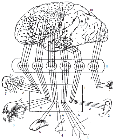 1–7 рецепторы (зрительный, слуховой, кожный, обонятельный, вкусовой, двигательного аппарата, внутренних органов); I – область спинного и продолговатого мозга; А – центростремительные (афферентные) волокна; II – зрительные бугры (таламус), где нервные импульсы переходят на нейрон, идущий к коре мозга; III – кора мозга