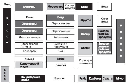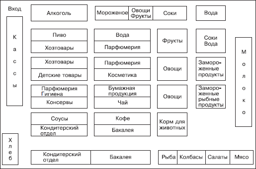 Для решения этой проблемы была разработана следующая методика. На рис. 28 представлен стандартный план торгового зала супермаркета [21] .