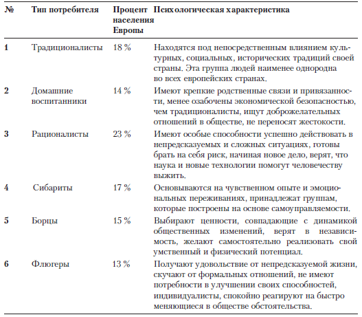 Агентство RISCпровело исследование в 12 европейских странах, а также в США, Канаде и в Японии ( Котлер Ф., Армстронг Г., Сондерс Д., Вонг В 1999). Цель исследования заключалась в том, чтобы определить влияние изменений, происходящих в этих странах на развитие рынков. Агентство RISCвыделило типы людей в зависимости от их социодемографических характеристик, социокультурного профиля, занятий (спорт, отдых, культура), реакции на сообщения средств массовой информации, политических наклонностей и настроений. Используя эти критерии, агентство RISCопределило типы потребителей для стран Европы.