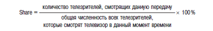 Share — доля тех, кто смотрит конкретную программу, среди тех, кто смотрит телевизор. Исчисляется как отношение рейтинга программы к суммарному рейтингу всех программ. С помощью этого показателя можно сравнить две программы,
