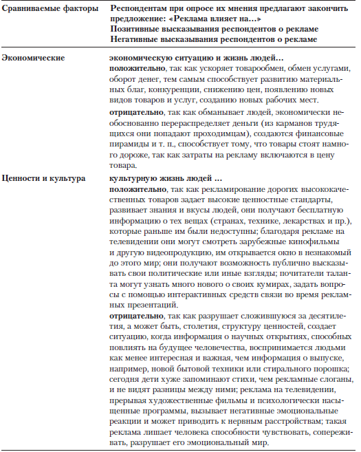 Следовательно, сегодня люди по-разному относятся к рекламе, что зависит от многих экономических и психологических факторов. Некоторые аргументы, полученные в результате многолетних массовых опросов, как в защиту рекламы, так и против нее, представлены в таблице 8.