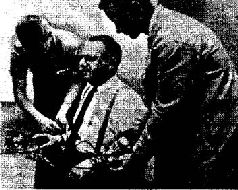 Рис. 6.1. Исследование Милграма. На снимке показано, как одетый в лабораторный халат экспериментатор и испытуемый-Учитель ремнями привязывают к креслу Учащегося (жертву) и прикрепляют к его телу электроды