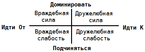 В данной схеме я просто «скрестил» возможные характеристики биовыживательного контура человека (они расположены по горизонтали) и потенциальные особенности его эмоционально-территориального контура (по вертикали). В результате получилось, что почти всех живущих на этой земле людей можно отнести к одному из четырех получившихся секторов: дружелюбной силы, дружелюбной слабости, враждебной слабости и враждебной силы.