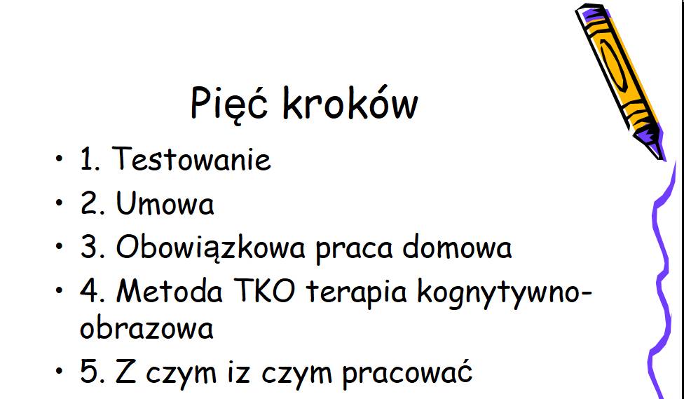 Sprobuje wiec dopasowac algorytm mojej pracy w 5 krokach. Krok 5 bedzie troche bardziej rozmyty. Bo z czym pracowac i jak pracowac w jednym kroku, postaram sie dac to w jednym kroku, no to jest troche szerszy krok niz pozostale. A wiec zaczynamy od testow. Testy, umowa, obowiazkowa praca domowa. Lubie zadawac prace domowa, praca powinna isc ze mna nie tylko w biurze, ale takze miedzy spotkaniami, to tez jest bardzo istotne. Metoda TKO (terapia kognytywno-obrazowa), tutaj podaje ja jako jeden z elementow mozliwej pracy. Wydaje mi sie, ze w pracy z depresja bardzo dobrze zmieni stan, dlatego na pewno wezme to za podstawe. Porozmawiamy jednak o tym, ze jedna metoda TKO tu nie wystarczy. Mimo to, od razu mowie, o metodzie TKO, ktora zna, rozmawialismy kiedys z Olga (kierowniczka szkoly metody TKO) na ten temat, na temat samej metafory metody TKO. Okazuje sie, ze zdrowa dieta jest wtedy, gdy czlowiek ma problemy zoladkowo-jelitowe, jesli przepiszemy mu tabletki, takie jak NLP, EMDR, hipnoza, ale nie zmienimy jego diety, diety. Bedzie to pomoc tymczasowa, ktora moze nie byc tak trwala, jak bysmy tego chcieli. Metoda TKO dziala bardziej jak prawidlowe odzywianie, dieta. To znaczy, czy mozna zmienic stan organizmu za pomoca jednej diety? Moc. I powie ci to kazdy specjalista w tej samej naturopatii. Czy mozemy zmienic nasze cialo za pomoca jedzenia? Moc. Ale sa sytuacje, w ktorych nie wystarczy juz tylko zmiana diety, a potrzebna jest dorazna pomoc, wprowadzenie tabletek. Czasami wrzod zoladka u osoby musi wypic serie tabletek. Tu jest tak samo, metoda TKO, to jak zdrowa dieta, ktora czlowiek powinien miec nawet po naszym leczeniu. Zeby wiedzial, jak w ten sposob utrzymac sie caly czas w normalnym stanie. Trudne etapy, odbedzie sie ze specjalista, nawet w tej metodzie. Poniewaz pozadane jest wzmocnienie go innymi elementami. Ale najlepiej byloby, gdyby metoda TKO pozostala stala dieta, ktora na zawsze utrzyma jego stan zdrowia. I o piatym kroku, z czym i jak pracujemy, rowniez o tym porozmawiamy.
