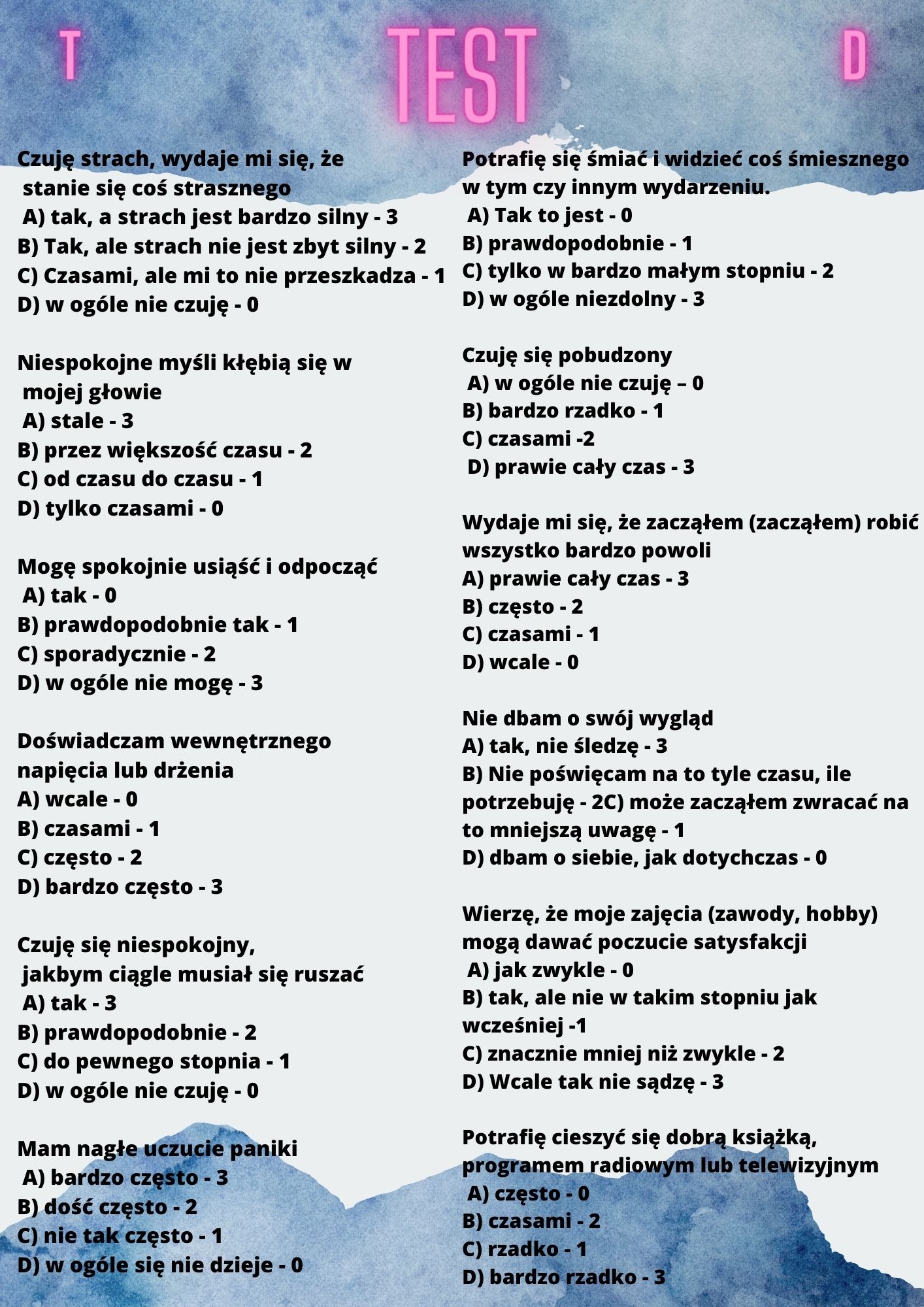 Jak to interpretujemy. Pierwsza kolumna to T – niepokoj. D – depresja. I ty i ja wiemy, ze lek jest pierwszym krokiem w kierunku depresji, kiedy psychika juz przestala sie opierac, nie majac sil wpada w depresje. Dlatego tez zwracamy na to uwage, gdy otrzymujemy wyniki. I spojrz, wyniki sa specjalnie podzielone na 2 kolumny. To jest informacja dla nas, nie dla klienta, po prostu dajemy klientowi ten test, ktory on po prostu zakresla, ktory mu sie spodobal z zaproponowanego. Rozwazamy wynik i dla siebie rozumiemy, ze to jest pierwszy dzwonek, to jest niepokoj i tam zlapiemy stan leku. A druga kolumna to depresja. A teraz wlasciwa interpretacja wynikow, od razu podaja ja tutaj, abyscie jej nie stracili. Do 7, w kazdej z tych kolumn, bedzie to norma i wszystko bedzie w porzadku. 8-10 to depresja, nie straszna. A jak jest powyzej 11 to juz na pewno wysylamy do lekarza, do psychiatry, na zasadzie do lekarza, bo masz dosc wysoki poziom i niewazne jaki wysoki jest lek lub depresja. Chociaz, wiesz, szczerze, teraz mam klientow, ktorzy przychodza, a oni maja 14-15. Albo tam 13-14. Sa duze liczby w dwoch kategoriach, ale nadal je biore, a nawet nie wysylam ich do psychiatrow, bo oni juz do nich chodza. Oni juz pija. Ale w praktyce rzeczywiscie, zgodnie z algorytmem, wedlug ktorego pracuje, stan zmienia sie bardzo szybko i jakosciowo. Dlatego czasami pisze te numery, ktore zalecamy lub wysylamy do lekarza, to jest takie klasyczne zalecenie. Ale wiem, ze w zasadzie mozemy zobaczyc, czy mamy wynik w ciagu 4 tygodni, wiec po co torturowac osobe. Poza tym pracowalem tymi samymi metodami, tym samym CAT i innymi rzeczami, kiedy jeszcze mieszkalem w Kijowie, pracowalem z psychiatra, w szpitalu ratunkowym, gdzie byl oddzial nerwic. I usunelismy wiele osob z leczenia psychiatrycznego, przenieslismy ich metoda TKO, przenieslismy ich do normalnego stanu bez pigulek. I dlatego zawsze rozumiem i tez klientom o tym mowie, ze nic sie nie zmienia, gdy sie bierze tabletki. Bierzesz pigulke i miazdzysz swoj stan, ale nie rozwiazujesz problemu. I psycholog rozwiazuje problem. Dlatego jesli widzisz, ze ta osoba nie ma tak bezposrednio strasznego problemu i mozna go rozwiazac, to po co stawiac go na pigulki, po ktorych nastapi kolejny zespol odstawienia, a stan sie pogorszy. I bedzie czysto fizjologiczne anulowanie tych pigulek. Tutaj musisz spojrzec na wlasne doswiadczenie, oczywiscie na problem klienta, jesli jest on calkowicie chory i jasne jest, ze ma szalony niepokoj i jest blady. Lub odwrotnie, jest juz tak przygnebiony, ze nie ma sily na nic, jeden z takich widocznych argumentow, zeby wyslac go do lekarza, widac, ze osoba w ogole, nawet pracujemy z nim w EMDR, musi patrzec w ruch i trudno mu poruszac oczami. Bo to juz jest dla niego takie trudne i zle. Ach tutaj, jego oczywiscie do lekarza.