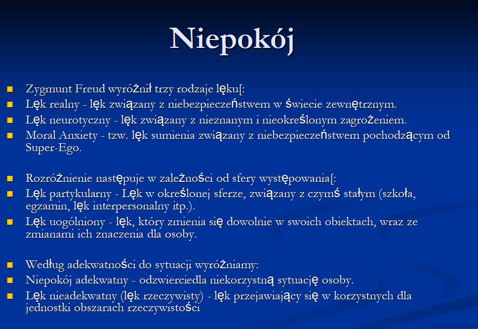 I tak, niepok'oj. Takie zlozone pojecie, tu na tym slajdzie oficjalne wersje tego, co to jest. Powiem ci w prostych slowach. Co to jest lek? Nie mozemy go zdefiniowa'c, bo wszyscy, kt'orzy z nim pracuja, kt'orzy pisza ksiazki i tak dalej, nie zdefiniowali go. Zdefiniujmy to tak, aby podczas wykladu bylo jasne, co mam na my'sli. Tak wiec, og'olnie rzecz biorac. Co bedziemy odr'oznia'c strach od leku, w tym, ze strach wyraza konkretnie obawe przed czym's, konkretno's'c, natomiast lek to taki stan og'olny, podniecenie. A w prostych slowach staralem sie tu napisa'c, ze lek z okre'slonego powodu to nadal lek, a lek bez powodu to nerwica. To samo, ze lek bez przyczyny tez jest nerwica. Tutaj podalem przyklad Zaburzenia obsesyjno-kompulsyjne, moze to by'c r'owniez hipochondria. I wszystko w zasadzie. Kazdy neurotyczny lek. Lek i strach to w zasadzie to samo, tylko strach jest wyra'zny, lek jest niewyra'zny. Dla obu sa dwa stany. Stan normalny i stan neurotyczny. Normalne jest wtedy, gdy boje sie czego's normalnego. Jest dom w ogniu i jest strach. To jest logiczne, jasne, normalne. Kiedy siedze i my'sle, ze co je'sli moze doj's'c do pozaru, to mam nerwice, bo nie ma takich warunk'ow, nie ma sytuacji, kt'ora moglaby stanowi'c jakie's zagrozenie, ale staje sie niespokojny; to sie nazywa nerwica.