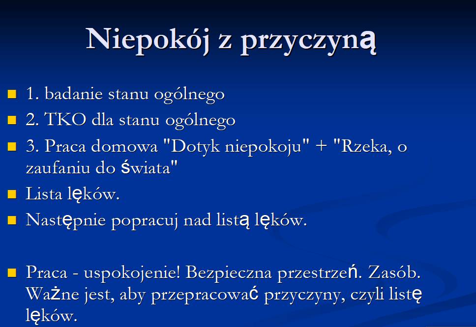 Nastepny. Praca domowa – dotyk niepokoju. Dotyk Leku Podalem to 'cwiczenie w webinarium na temat Depresji. Powt'orze to tutaj. To wtedy uczymy osobe 'swiadomego dotykania leku. Lek czesto pojawia sie u os'ob lekowych w momencie pojawienia sie jakiego's bod'zca, na kt'ory dana osoba musi zareagowa'c, a osoba lekowa chce zareagowa'c szybko. I dlatego naszym zadaniem jest nauczy'c czlowieka dotyka'c tego pragnienia szybkiej reakcji, a takze 'swiadomie obserwowa'c te niespokojna reakcje w sobie. Jak to sie dzieje? Prosimy osobe, by nie odbierala telefon'ow, nie pisala sms'ow, nie pukala do drzwi i generalnie nie odbierala zadnych telefon'ow zanim nie policzymy do 3, lepiej do 4. Ale sa osoby niespokojne, kt'ore nie potrafia liczy'c do wiecej niz 2. Z nimi zaczynamy od 2. Raz, dwa i dopiero po tym odbieramy telefon. W tym momencie osoba lekowa bedzie miala w 'srodku takie bezpo'srednie przerazenie, bo chce zareagowa'c. I musi zrobi'c pr'oznie, ze zrobie to w 2 sekundy, a te 2 sekundy, beda wydawaly sie czym's niewiarygodnym, dlugim, strasznym. Ale poprzez ten dotyk niepokoju hartujemy go i je'sli w pierwszym tygodniu robi to przez 2 sekundy naraz, to w nastepnym tygodniu jest w stanie zrobi'c to przez 4 sekundy. W nastepnym tygodniu jest w stanie zrobi'c to przez cztery sekundy. A og'olny niepok'oj obniza sie dzieki mozliwo'sci podtrzymania tego napiecia w sobie. To jest hartowanie, to tak jakby'smy hartowali osobe, hartowali mie'snie. Te akcenty sa male, ale pompuja. A jedno z moich ulubionych 'cwicze'n to "Rzeka, na zaufanie do 'swiata" to tez symbol dramatu, mozna tak powiedzie'c. My'sle, ze to mieszanka, bo w klasycznym dramacie symbolicznym tam rzeka wyglada inaczej. W kazdym razie wyzwanie jest takie. Codziennie wyobraza'c sobie, ze czlowiek kladzie sie na plecach w wodzie, na wyimaginowanej rzece i patrzy jak rzeka go niesie. I tak musi sie nauczy'c spokojnie leze'c w wodzie. Na poczatku bardzo sie boi. Poza tym, rzeka musi by'c inna. Czasem moze trafi'c na poklad, czasem na male obnizenie w tej rzece, r'ozne rzeczy moga plywa'c i czlowiek musi nauczy'c sie ufa'c tej rzece, po prostu plyna'c z pradem. I obserwuj. Tak, to co mam dzisiaj jest ciekawe, tu rozbicie o poklad, kloda plywajaca obok. To zn'ow nutka niepokoju, ale w bezpiecznym miejscu. To znaczy, ze jest sie w swojej wyobra'zni, nic jej nie zagraza. Ale wla'snie w tej wyobra'zni hartuje sie, dotykajac tych trudno'sci, kt'ore pojawiaja sie na jego drodze. I to jest wla'snie takie 'cwiczenie, kt'ore jest zar'owno, 'cwiczeniem treningowym. Terapia behawioralna. Kiedy pielegnujemy w sobie nowa reakcje. Tworzymy nowe polaczenie neuronowe, reagujemy. Robimy je od podstaw, z grubsza rzecz biorac. Po prostu hartowanie sie, trenowanie siebie. Czy nie byla to umiejetno's'c? Rozwijamy te umiejetno's'c. Te dwie techniki sprawdzaja sie bardzo dobrze. R'owniez je'sli mezczyzna jest bardzo podejrzliwy, religijny lub indoktrynowany w sensie rzeczy ezoterycznych. Mozesz tez zaproponowa'c mu 'cwiczenie – Odpowiedzi z Wszech'swiata. Kiedy jego zadaniem jest zadawanie pyta'n – szukanie odpowiedzi, aby opr'ocz 'cwicze'n, kt'ore wykonuje. Dzieki temu nauczy sie czu'c podstawowe bezpiecze'nstwo, zobaczy, ze 'swiat mu odpowiada, ze nie jest sam. Je'sli otrzymuje odpowied'z, to znaczy, ze jest potrzebny, ze jest cze'scia tego 'swiata. Podstawowe zaufanie 'swiata. Nastepny. Lista lek'ow. Bo ten lek ma specyficzne leki, bo, tu przychodzi osoba, boje sie tego, boje sie domu, boje sie tego, ma specyficzne, peczek, duzo r'oznych lek'ow. I prosimy o wpisanie tych wszystkich lek'ow do pracy domowej – w formie listy. I tak, kiedy osoba przychodzi z ta lista, oceniamy kazdy lek od 0 do 10 i pracujemy tak, jak juz robili'smy to na slajdzie o Leku. Wszystko oceniamy, wszystko co jest 3-4 zostawiamy nietkniete, z tymi co sa 8-10, duzymi liczbami, pracujemy z nim w gabinecie. Za prace domowa dajemy najmniejsze, jest ich 5-6. Np. cala lista, a tu boi sie je'zdzi'c autobusem za 5-6, a ma lek o swoje zdrowie, za 10. W takim razie zrobie jak. W gabinecie zrobie uzdrowienia za 10, a w pracy domowej dam jej strach za 5-6 CAT i niech robi to w spokoju. Bardzo podoba mi sie r'owniez technika strachu, dziala bardzo dobrze. Dziala bez przeciwwskaza'n. Nadaje sie nawet dla kobiet w ciazy. Gdy wybieramy kolor strachu – arteterapia. I pozwalajac sobie na do'swiadczenie tego leku, znowu widzicie, dotykajac tego leku. Bo zazwyczaj jak czlowiek sie czego's boi, to boi sie myszy i nie my'sli o nich. My'sli i jako's czuje sie nieswojo, a nie my'sli o nich. I tu musi powiedzie'c: jakiego koloru jest m'oj strach? Szary, jak mysz. 'Smialo, we'z kartke A4 i pomaluj ja szczeg'olowo, pozwalajac sobie na my'slenie o swoich lekach w tym momencie, na my'slenie o tych myszach. I oto wyobrazam sobie, jak mnie gryza, jak pelzaja po mnie. I to wszystko, czego sie boi, to tylko malowanie po kartce papieru. Pomalowal cala kartke A4 i zadal sobie pytanie? Czy kolor strachu sie zmienil, czy nie? I by'c moze z takiej ciemnej mysiej szaro'sci przeszla do jasnej szaro'sci. Fajnie, we'z nastepny arkusz, jasnoszary i zazwyczaj przy 3 arkuszu cze's'c strachu juz zniknela. Takie rzeczy, tak, za 5 lub 6, i zabieramy do domu do osoby. Tak, je'sli pracuje sie z tym samym psychokatalizatorem, to dajemy mu go r'owniez za 5-6. Tutaj robisz to w domu. Albo przeprowadzasz z nim kiedy's psychokatalize w swoim gabinecie. Dla tych, kt'orzy nie wiedza, czym jest psychokataliza, pozwole sobie wyja'sni'c. Andrey Fedorovich Yarmoshin, autor psychokatalizy, metody. Latwo zapamieta'c, ze chodzi o rzeczy w ciele. A w duzym skr'ocie byloby to tak. Wszystko bierze sie stad, ze cialo rejestruje nasze leki w sobie, w postaci pewnych dozna'n, kt'ore mozemy tlumaczy'c jako pewne obiekty, je'sli chcemy. I teraz bardzo wazna kwestia, m'owimy, takie dziwne pytanie do klienta. Gdzie w ciele jest 'slad po zdarzeniu, kt'ore wywoluje ten lek? Nie szukamy samego strachu. Bo sam strach bedzie zlokalizowany w pewnym miejscu. Nie