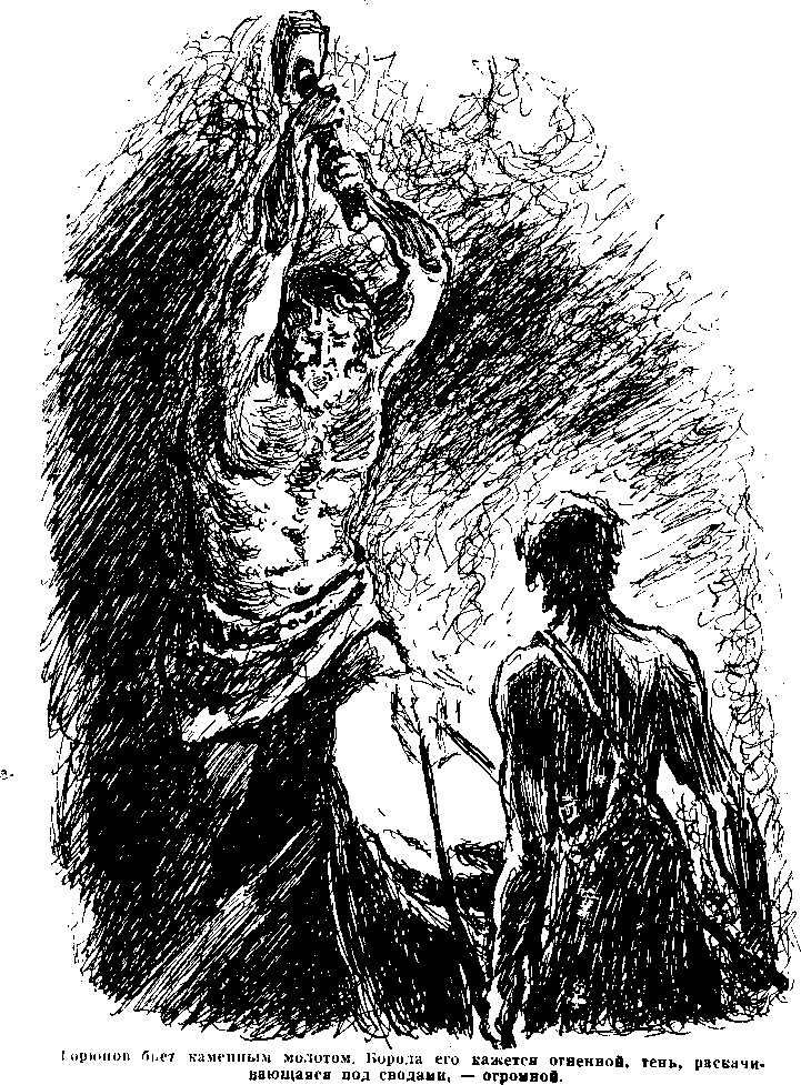 …Закоулок пещеры, превращенный в кузницу. Ълики пламени на стенах. Кеюлькан держит щипцами раскаленное железо. Горюнов бьет каменным молотом. Борода его кажется огненной, тень, раскачивающаяся под сводами, — огромной. Это новый Прометей, похитивший у злых духов их сокровище, чтобы осчастливить людей.