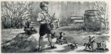 мишку и лохматую собаку на колесиках.Все игрушки построились одна за другой, а Петя стал колотить в новый барабан: трам-тара-рам-там, там, там, там!