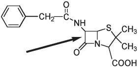 Структура молекулы пенициллина G. Стрелкой показано -лактамное кольцо.