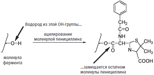 В ходе реакции ацилирования раскрытое четырехчленное кольцо пенициллина присоединяется к молекуле бактериального фермента