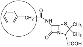 На рисунке изображена формула пенициллина G, который был впервые выделен из плесени в 1940 году и до сих пор широко применяется. Из плесеней были выделены многие другие виды пенициллина, а некоторые были синтезированы химическим путем из природных версий антибиотиков этой группы. Антибиотики из группы пенициллина различаются только структурой той части молекулы, которая обведена окружностью.