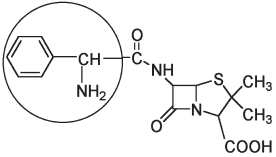 Ампициллин (синтетическое производное пенициллина, эффективное против устойчивых к пенициллину G бактерий) имеет очень похожую структуру. Он имеет лишь одну дополнительную NH2– группу.