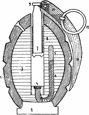 1. Корпус. — 2. Крышка. — 3. Заряд. — 4. Капсюль. — 5. Капсюль-детонатор — 6. Бикфордов шнур. — 7. Ударник. — 8. Боевая пружина — 9. Головка ударника. — 10. Внешний рычаг. — 11. Ось рычага. — 12. Кольцо предохранительной чеки.