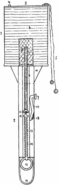 4) Вставить ручку в горловину. На конце ручки есть два пружинных ушка; их надо прижать и, вставляя рукоятку, направлять ее так, чтобы ушки пришлись против прорези горловины, в которые они и выскочат, как только рукоятка войдет на свое место.