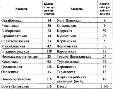 Всего в войсках — 4098 пулеметов, в запасе — 69. Общая нехватка — 833 пулемета — падала на полки второй очереди и резерв. Но при одной 8-пулеметной команде на каждый пехотный и стрелковый полк 4-батальонного состава и на каждую 2-бригадную кавалерийскую дивизию (24 эскадрона) в среднем один пулемет приходился на 1000 человек. Что же касается упомянутых 3-й и 9-й Сибирских стрелковых дивизий, то они, по приводимым в литературе данным, к началу мировой войны имели лишь по одной 8-пулеметной команде.