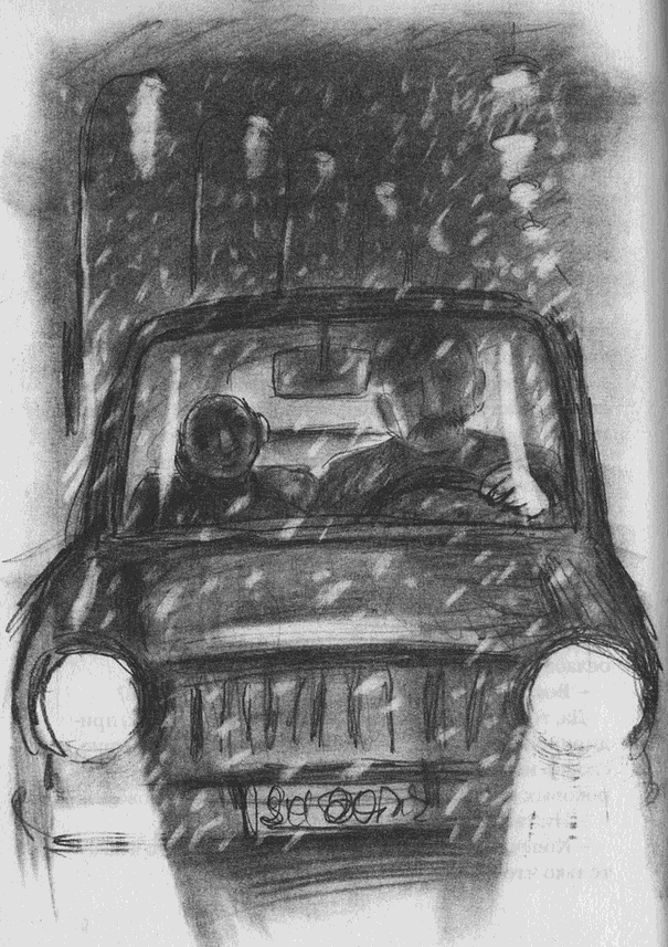 Хотя до школы было рукой подать, мы поехали на машине. На спортивной площадке зажгли прожектора. Их лучи, словно метлы, мотались в вечернем небе, а снег падал мокрыми хлопьями на лобовое стекло.