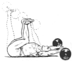 5. Лечь на спину и поднять ноги так, как это показано на нашем рисунке. Взять руками лежащую около головы гантель весом от 20 до 30 фунтов и положить ее на подошвы ног; затем, убедившись, что она лежит крепко на ногах, выжать ее вверх так, чтобы ноги образовали по отношению туловища прямой угол; повторить это от трех до пяти раз в зависимости от силы упражняющегося.