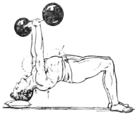 4. Сделать мост и в то же время обеими руками выжимать гантель, весом от 30–50 фунтов. Под голову надо подложит твердую подушку (за неимением ее, можно подложить свернутую куртку или что-нибудь другое); при этом тело должно лежать всецело на затылке и подошвах. Если этот прием покажется слишком трудным для начинающих, его можно делать не сразу, а сначала сделать мост и потом уже выжимать тяжесть, причем, чем круче будет мост, тем легче будет подъем гантели. Этот прием следует повторить три раза и, прибавляя по одному каждую неделю, постепенно дойти до десяти; затем увеличить вес на пять фунтов и уменьшив число упражнений до трех, опять постепенно его увеличивать. Это превосходный прием для развития мышц затылка и спинного хребта.