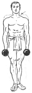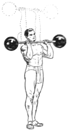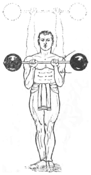 4. Взять гантель в 50 фунтов обеими руками и выжать ее, употребляя при этом только мышцы плеч. Прием надо повторить десять раз, пять раз взявшись руками за гантель так, чтобы ладони были обращены к себе и пять раз обратно; каждую неделю прибавлять по одному разу и постепенно увеличивать вес.
