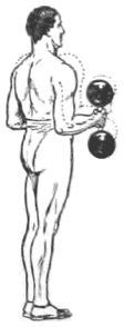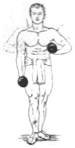 3. Стать прямо, взять в каждую руку по пятифунтовой гантели, и поочередно сгибая руки, поднимать их до положения, указанного на рисунке. Начать с пяти упражнений и, каждую неделю прибавлять по одному, затем увеличить вес каждой гантели на один фунт и начинать опять сначала.
