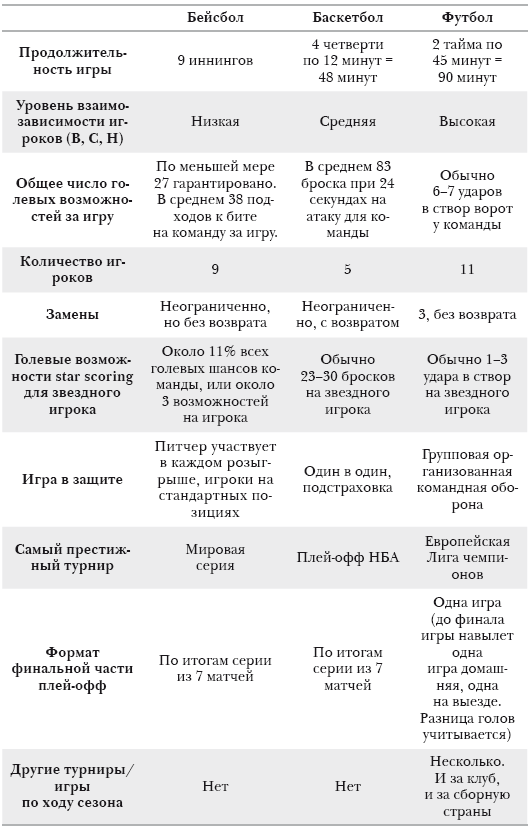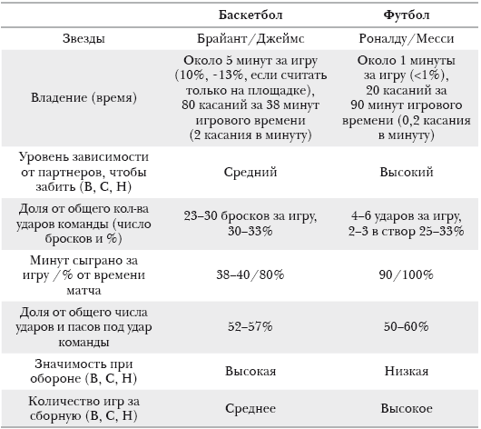 Из этих 4–6 ударов, которые наносят Роналду и Месси, половина попадает в створ ворот; половина из ударов в створ (то есть 25 % от общего числа ударов) становятся голами, что невероятно много по сравнению с другими футбольными звездами. Роналду и Месси вовлечены в 50–60 % ударов своей команды, если учитывать передачи под удар, эти показатели идентичны показателям Джеймса и Брайанта в НБА. Однако влияние Роналду и Месси на игру команды в защите более ограничено. Поэтому, даже имея в составе таких звездных игроков, как эти двое, взаимодействие на поле должно быть исключительно отточенным и слаженным, намного более тесным, чем в бейсбольных и даже баскетбольных командах. К тому же величие звезд баскетбола Брайанта и Джеймса не идет ни в какое сравнение с величием Месси и Роналду. Они лидируют с большим отрывом во всех бомбардирских рейтингах. Не важно, кто из них лучше, статистический анализ данных показывает, что они значительно лучше любого другого футболиста. Приз лучшему игроку года по версии ФИФА «Золотой мяч» с 2008 года выигрывал либо Роналду, либо Месси. В НБА, в отличие от футбола, нет двух игроков, которые бы признавались лучшим игроком года или показывали запредельно высокие результаты на протяжении 7 лет [51] . Если исключить влияние Месси и Роналду, футбол превращается в игру, в которой взаимодействие между игроками намного более развито, чем даже в баскетболе.
