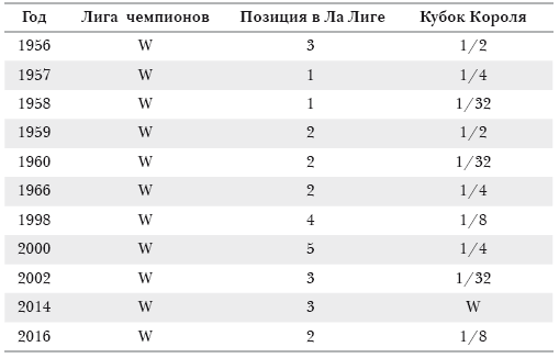 «Реал Мадрид» широко известен благодаря победам в Кубке чемпионов, но я проанализировал выступление клуба в Ла Лиге на предмет возможной корреляции с успехами в Европе, чтобы получить более полную картину выступлений клуба. Только дважды, в 1957 и 1958 годах, «Реал Мадрид» завоевал титул Ла Лиги и Кубок чемпионов в одном сезоне. Кстати, последние четыре победы «Реала» в Лиге чемпионов сопровождались третьим или более низким местом в Ла Лиге. Лишь в 2014 году «Реал Мадрид»
