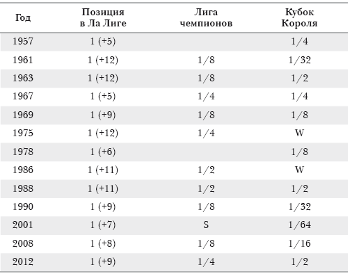 Если проанализировать сезоны, когда «Реал Мадрид» выигрывал Ла Лигу с преимуществом в 5 или более очков, то, за исключением 1957 года, команда даже не выходила в финал Кубка чемпионов. А победу и в Ла Лиге и в Кубке Короля «Реал Мадрид» одержал только в 1968 году.