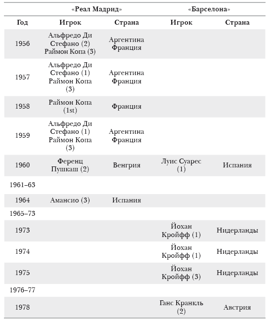 Итак, несмотря на пять побед «Реала» подряд в Кубке европейских чемпионов (с 1955–1956 по 1959–1960 годы), другие команды в конце концов настигли его. «Реал Мадрид» выиграл еще один Кубок чемпионов в 1960-х; тогда в его составе играли одни испанцы, трое из которых были выпускниками академии. После этого клуб не выигрывал Кубок чемпионов/Лигу чемпионов до конца 1990-х. Упадок его становится очевидным, если посмотреть, сколько игроков «Реала» и «Барселоны» номинировались на Золотой мяч [72] . С 1956 по 1960 год футболисты «Реала» входили восемь раз в тройку претендентов на «Золотой мяч»: Ди Стефано (1956, 1957 и 1959), Копа (1956–1959) и Пушкаш (1960); игрок «Барселоны» за тот же период в тройке оказался только один раз (Луизито, 1960). Ни один из номинантов «Реала» не был испанцем. За следующие 17 лет, с 1961 по 1978 год, игрок «Реала» попал в тройку номинантов лишь раз (испанец Аманисио Амаро, 1964), а «Барселону» представляли четырежды (1973–1975, 1978).