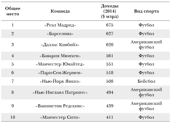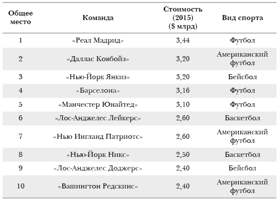 «Реала» равняется пятикратному годовому доходу (аналогично ситуации с продажей клуба НБА «Милуоки Бакс» в 2014 году, что на самом деле несравнимо с истинной стоимостью «Реал Мадрид»).Таблица 1.1