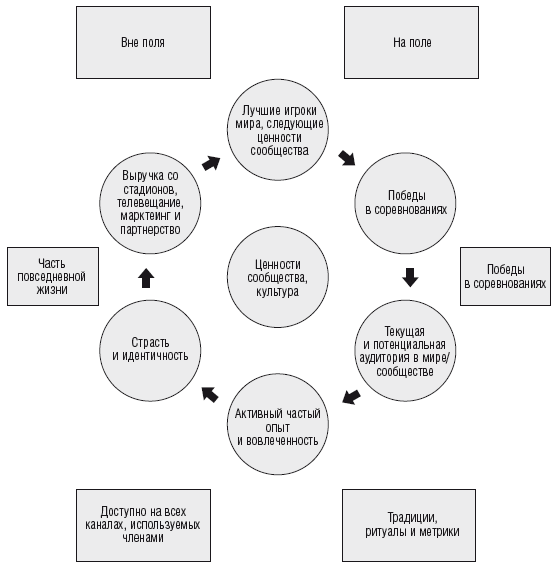 сообщества, оно отвечает большей вовлеченностью в жизнь клуба, любовью и верностью. Поскольку общественные ценности «Реала» являются всеобъемлющими и доступными для всех, само сообщество растет во всем мире, что привлекает спонсоров, которые тратят большие деньги, стремясь заключить соглашения с «Реалом» и получить доступ к его сообществу, так же как и телевизионные компании, готовые платить большие деньги за возможность освещать игры «Реала» для огромной, фонтанирующей эмоциями аудитории. Футбольная страсть приводит к увеличению посещаемости, стоимости прав на трансляцию, а также к росту маркетинговых и спонсорских возможностей, которые способствуют росту доходов. Так как Флорентино и его команда реализовали свою устойчивую модель экономического роста, доходы росли по мере того, как болельщики стали еще сильнее отождествлять себя с клубом и игроками и становились все более преданными и верными. А потом круг завершается: высокие доходы позволяют приглашать лучших игроков, которые разделяют ценности клуба [27] . Фанаты «Реала» хотят видеть игрока на поле и думать про себя: «я хотел бы играть и быть таким, как этот игрок; я бы хотел, чтобы мой сын или моя дочь играли и были такими, как этот игрок; я хочу побеждать в таком стиле и олицетворять такие ценности».27