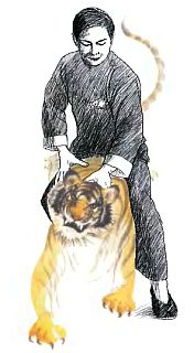 Представьте, что вы сидите верхом на тигре, стопы ваших ног прочно стоят на земле. Тело тигра удерживается между вашими ногами таким образом, что его длинный хвост и мощные задние лапы вытянуты у вас за спиной. Его спина проходит между ваших бедер и далее под вашими ладонями. Когда вы направляете
