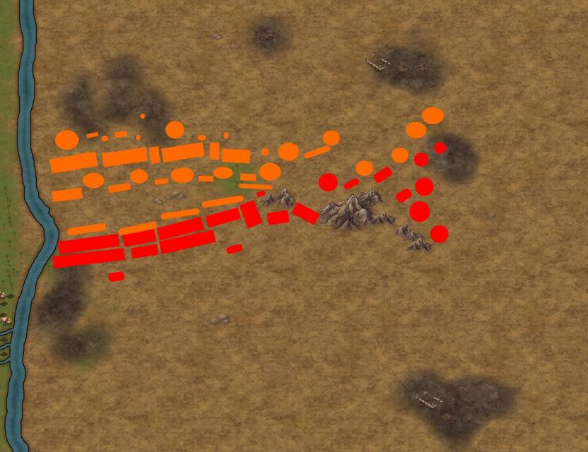 Правый фланг нашей армии и левый фланг вражеской соответственно имели очень приблизительные и постоянно меняющиеся очертания. Кавалерийские отряды быстро сближались между собой, завязывая перестрелки.