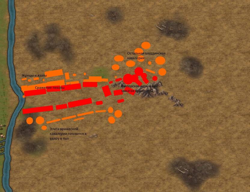 Гораздо хуже ситуация складывалась на правом фланге и в тылу. Враг вывел туда практически всю доступную кавалерию. Элита, стандартные саваран, всадники степей. Мощи этой конной армады хватало, чтобы не давать высовываться Октану Мерцину и одновременно копить у нас в тылу силу для нового удара. Теперь уже более масштабного. Возглавлять его, похоже, собирались Ксерион и Келим.