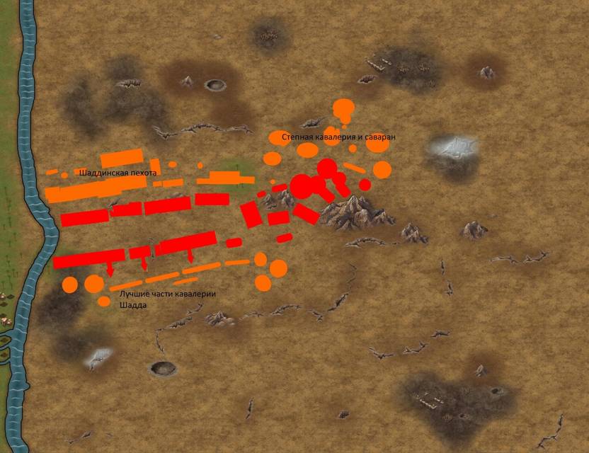 Несколько секунд небесной канонады ещё больше напугали лошадей. Почти вся шаддинская кавалерия обратилась в неуправляемую массу. Некоторые вражеские слоны с перепугу бесились, топча собственных союзников. Полнейший хаос. Этим надо было пользоваться!