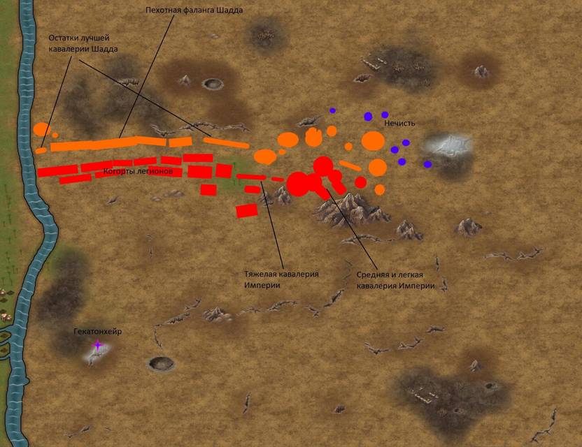 Армия Востока перестроилась. Оставшаяся пехота попыталась сформировать одну большую фалангу. Не в смысле особое построение с использованием длинных копий, а просто единую широкую линию. Самая боеспособная кавалерия заняла фланги. В основном правый. Однако четыре сотни бронированных всадников оказались и на левом у реки. В основном там были тяжёлые саваран.