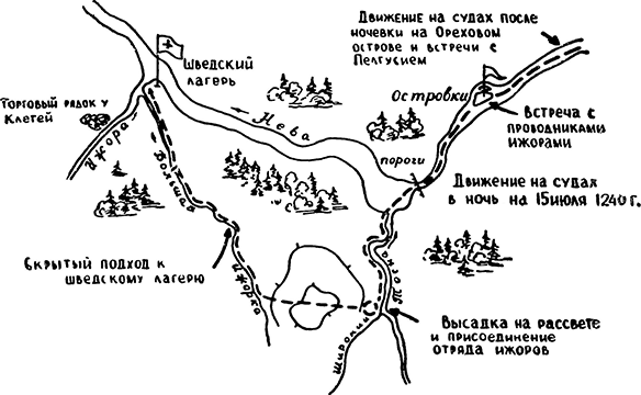 Вся местность в те времена была покрыта сплошным лесом. Впереди войска двигались проводники-ижоры, а поблизости от вражеского стана находились их разведчики, следившие за шведами.
