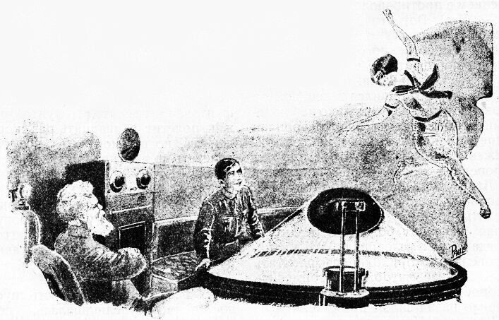Как только остановился аэроплан, Миггс захотел убедиться, что он, действительно, потерял вес и сделал прыжок кверху. Тут случилось нечто совершенно неожиданное для него. Вместо того, чтобы подняться прямо кверху, он несколько раз быстро перекувырнулся в воздухе, потом его сильно подбросило к потолку и стало швырять вниз и вверх, пока Пеп, крепко держась рукой за кресло, которое было прикреплено к аэроплану, как и все остальные предметы, не поймала его другой рукой.