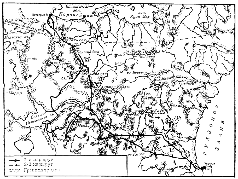 Теперь в нашем отряде уже насчитывалось не меньше семидесяти человек. Все мы были заняты во время нашей десятидневной стоянки у Тлевиазы заготовкой мяса и небольших связок тонких березовых стволов толщиной в дюйм с четвертью и длиной семь-восемь футов. Стволы послужат шестами для типи летом в тундре, а с наступлением зимы будут переделаны в рамки для снегоступов. Собирали и материал для постройки каноэ — бересту и толстые ветки для каркасов, потому что за Тлевиазой хороших березовых рощ уже нет. Все деревянные заготовки подрезались до удобных для переноски размеров, так как было решено начать строить каноэ, только когда мы поднимемся на север до озера Клоуи, где уже начинается тундра.