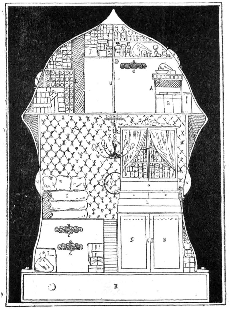 A — лабораторная печь. B — электрическая батарея Трувэ. CCC — свернутые и привязанные к стенам гамаки. D — полки с химическими приборами. E — помещение для бутылей с жидким кислородом. FFF — помещение для припасов. K — электрическая люстра. L — выдвижная конторка. M — библиотека. N — туалет и комод для платья. O — кухня. R — резервуар для сгущённого воздуха. T — диван. YYY — окна.