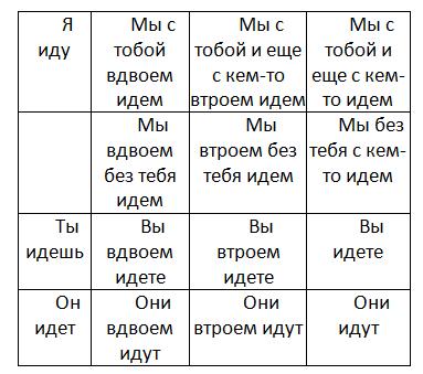 что есть языки, в которых кроме обычных двух чисел есть еще двойственное и тройственное, то число возможных лиц вырастает из 6 до 15! Именно 15 форм и встречается в языке жителей острова Абрим (Океания), где глагол спрягается следующим образом: