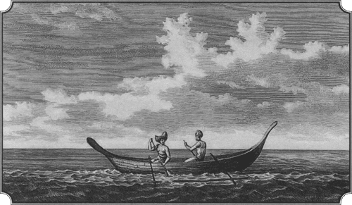 Я преподнес несколько подарков этим туземцам. Они особенно обрадовались лоскутам окрашенной холстины, гвоздям, ножам и бусам. Но еще сильнее они хотели получить шляпы: у нас было небольшое их количество, поэтому мы могли подарить их лишь некоторым из них. В восемь часов вечера я отпустил моих новых гостей, сообщив им с помощью знаков, что на рассвете я намереваюсь высадиться на остров. Пританцовывая, они погрузились в шлюпку, из которой выпрыгнули в море на расстоянии двух мушкетных выстрелов от берега — в это время о него с силой разбивались волны. Они позаботились о моих подарках, сделав из них маленькие свертки: каждый положил свой на голову, чтобы защитить от воды.