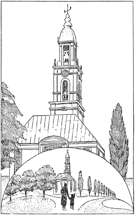 Разницу между зрительным пространством ребенка и взрослого поясняет илл. 12, наглядно демонстрирующая наблюдения, изложенные Г. Гельмгольцем [46] . Он рассказал, как, будучи маленьким мальчиком, проходил мимо Потсдамской гарнизонной церкви и заметил на ее колокольне нескольких рабочих. Тогда он спросил у своей матери, не может ли она достать ему этих маленьких куколок. Церковь и рабочие находились как раз на самой дальней для него плоскости и потому были не далекими, а маленькими. Вследствие этого он имел все основания предполагать, что мать своей длинной рукой может снять куколок с колокольни. Он не знал, что в окружающем мире его матери у церкви совсем иные размеры, а на колокольне находятся