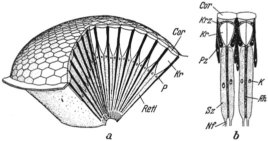 Условные обозначения: Cor — роговичные фасетки; К — ядро; Kr — кристаллический конус; Krz — клетка хрустального конуса; Nf — нервное волокно; P — пигмент; Pz — пигментные клетки; Retl — ретинула; Rh — рабдом; Sz — зрительная клетка.