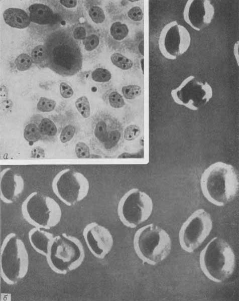 а — клетки HeLa, выделенные из опухоли матки женщины и выращенные на искусственной питательной среде (световой микроскоп), б — красные кровяные тельца (электронный микроскоп)