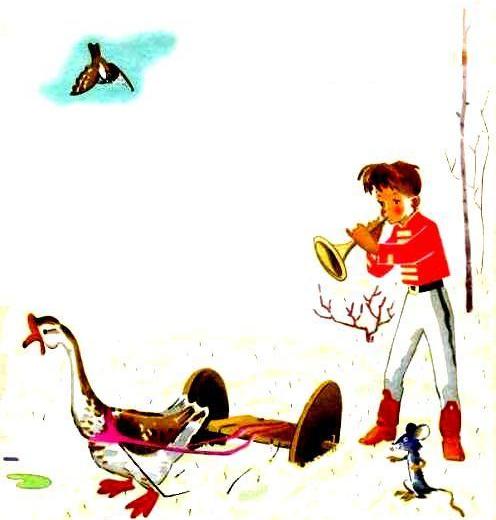 Падая, мальчик заметил, что в канаве мелькнул повязанный платочком мышонок. Он мгновенно скрылся в норке под чертополохом. Закомарик запищал, как мышонок, затем вытащил из кармана дудочку и заиграл на ней. Мышонок выскочил из норки и, пританцовывая, начал приближаться к мальчику.