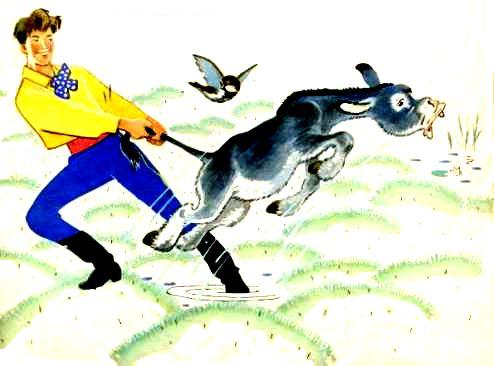 Закомарик принялся тянуть осла за уши, но животное не пожелало двинуться вперёд, а тащило назад, всё больше увязая в тине. Закомарик ничего не мог поделать с упрямым ослом.