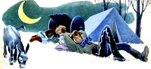 Возле небольшой палатки храпел длинноногий Всегдаищи. В палатке спали толстуха Потеряха и маленькая Закомашка. Укротитель диких зверей - мальчик Закомарик с лягушкой и мышонком разместились под тележкой, а воробушек устроился на ветке ближайшего куста.