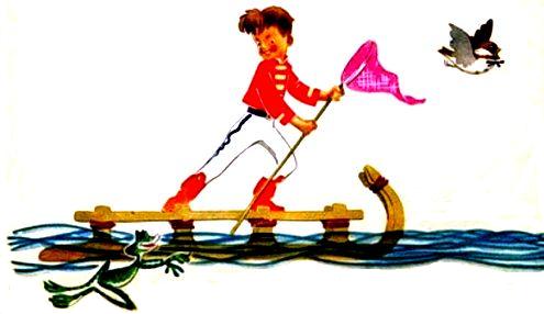Он выпустил лягушку в речку, приказав ей плыть за ним. А когда поднялся ветерок, мальчик поставил вместо мачты рукоятку сачка. Сачок надулся, как парус, и корабль помчался по реке.