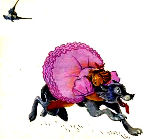 Не успел волк миновать поляну и пробежать каких-нибудь десять шагов, как почувствовал, что дальше двигаться не в силах. Он был уверен, что на нём сидит не иначе, как медведь. Толстуха же, думая, что она едет на ослике, покрикивала: - Скорее, скорее!